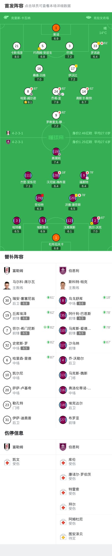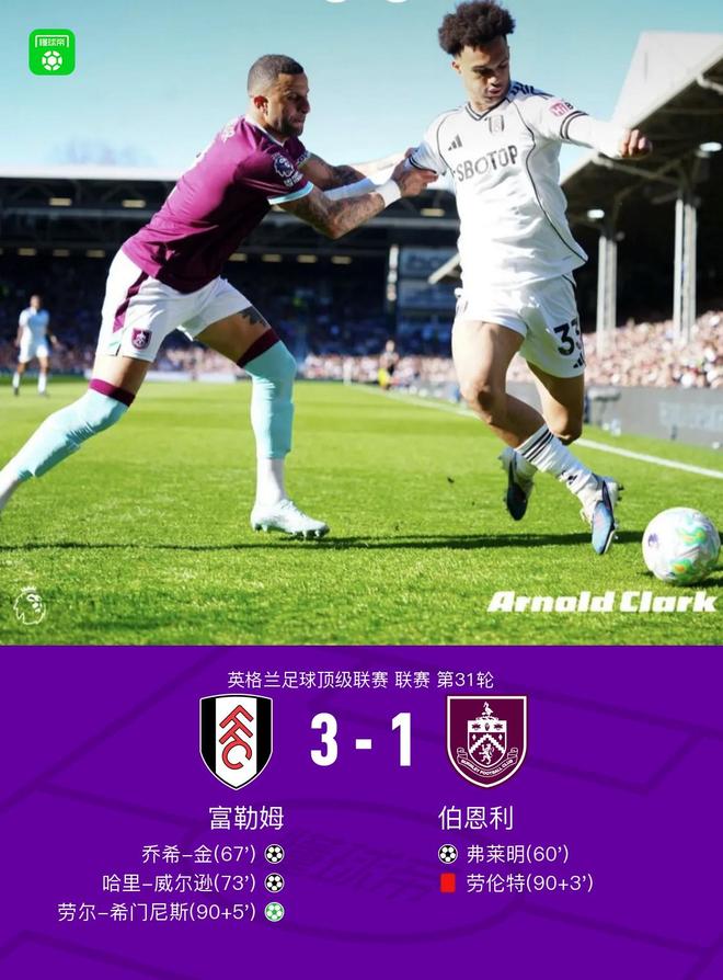 富勒姆31伯恩利,希门尼斯点射,劳伦特染红