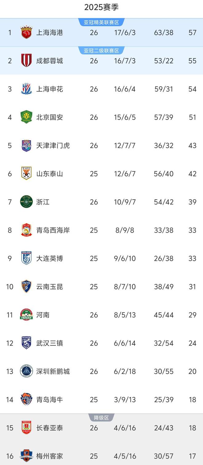 在此前结束的比赛中,上海申花6-1大胜梅州客家,北京国安4-2击败大连英博,成都蓉城客场3-3遭浙江队绝平,上海海港3-2绝杀武汉三镇,长春亚泰则2-2绝平青岛海牛。