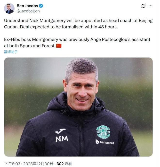 在此之前,记者雅各布斯也在社交媒体发文称,尼克-蒙哥马利将出任北京国安主帅,双方预计将在48小时内签署正式协议。