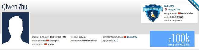 北京时间3月4日,德转更新,原上海申花中场朱启文正式加盟南京城市。