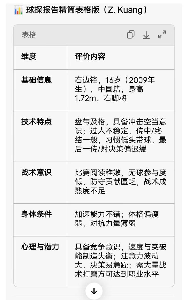 这个球探报告写了啥,翻译过来就是(下图)几点:分别有基础信息、技术特点、战术意识、身体条件以及心理和潜力5大块内容,还挺全面的。邝兆雷的基础信息大家都清楚,这里就不赘述了。就单独说说其他4大块。
