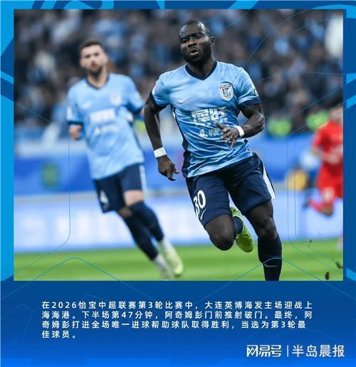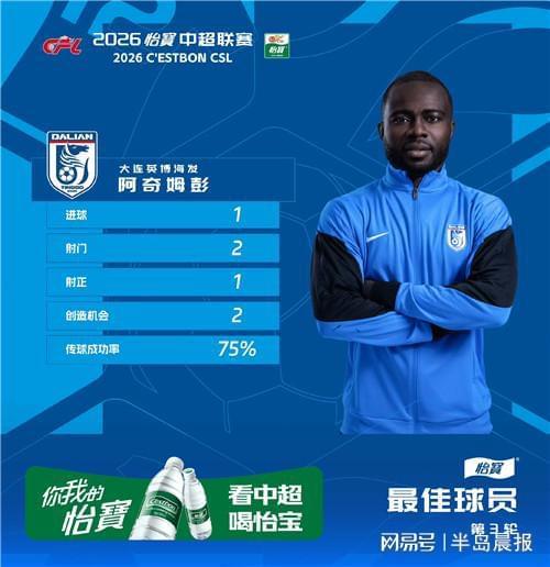 中超第三轮最佳球员评选结果出炉,大连英博外援阿奇姆彭当选。在与上海海港的比赛中,他攻入制胜一球,帮助球队取得赛季首胜。